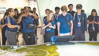 在河北雄安新區(qū)“雄安印象”展館,馬斯卡廷中學(xué)學(xué)生與石家莊外國語學(xué)校學(xué)生觀看雄安新區(qū)規(guī)劃示意模型。