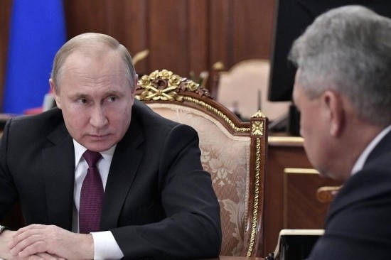 2019年2月2日,在俄羅斯莫斯科,俄羅斯總統(tǒng)普京(左)會(huì)晤國(guó)防部長(zhǎng)紹伊古和外交部長(zhǎng)拉夫羅夫(不在畫(huà)面中)。新華社/衛(wèi)星社
