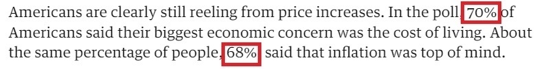 在《衛(wèi)報(bào)》發(fā)布的民意調(diào)查中,有70%的受訪(fǎng)者表示,他們最大的經(jīng)濟(jì)擔(dān)憂(yōu)是生活成本;大約同樣比例的人(68%)說(shuō),通貨膨脹是他們最關(guān)心的問(wèn)題。