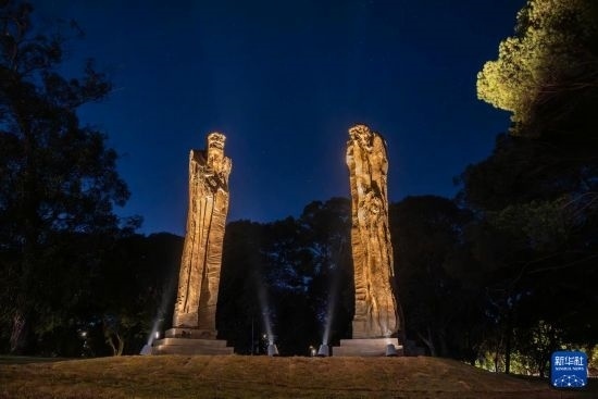 這是5月28日在烏拉圭首都蒙得維的亞市中心的巴特列公園拍攝的雕塑作品《問(wèn)道》。新華社發(fā)(陳曦?cái)z)