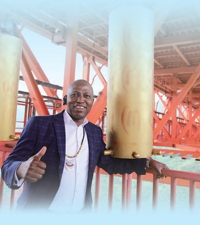 在位于安順市的壩陵河大橋,尼日利亞駐上??傤I事館商務專員哈桑在觀光步道中央拍照留念。