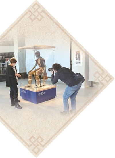 加入科研團(tuán)隊(duì)的德國服裝設(shè)計(jì)師卡特琳·迪爾斯娜第一次接觸古代服飾文物,但多年來為歷史題材電影和戲劇制作服飾的經(jīng)驗(yàn)對她很有幫助。此次全套服裝包括素絹高領(lǐng)短衫、粉色拼接藍(lán)色羊毛束口長褲、與長褲同色系的羊毛短靴(靴口為素絹)、素色絲質(zhì)裹身半裙、裝飾與配色同樣考究的套頭長袍,以及下緣綴有風(fēng)琴褶的淺金拼淡玫紅色絲質(zhì)大衣——經(jīng)過科學(xué)復(fù)原,古代服飾的時(shí)尚審美與紡織技藝令人嘆服,衣物主人的綽約風(fēng)姿也穿越千年風(fēng)沙,宛在眼前?!翱吹竭@些服裝一件件穿在真人模特身上,完美地隨身搖擺,我被深深打動(dòng)。那一刻,我和2000多年前的人與物情感相連,感受相通?!钡蠣査鼓日f。