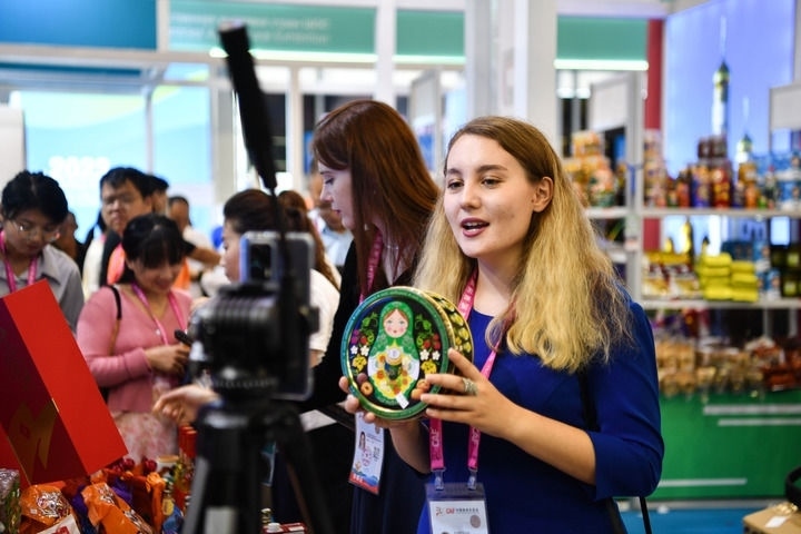 2023年9月19日,來自俄羅斯的參展商在中國陜西楊凌農(nóng)高會(huì)展臺(tái)進(jìn)行直播。新華社記者 張博文 攝