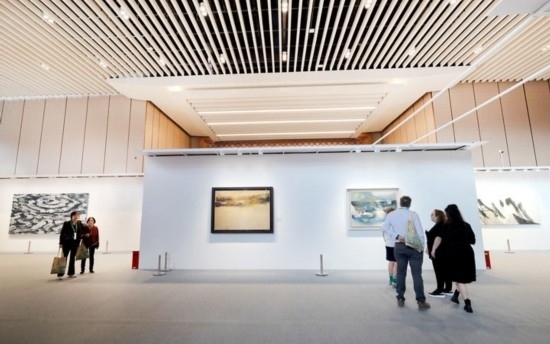 11月9日,觀眾在第七屆進博會國際現(xiàn)當(dāng)代藝術(shù)專區(qū)觀看繪畫藝術(shù)展品。新華社記者 方喆 攝