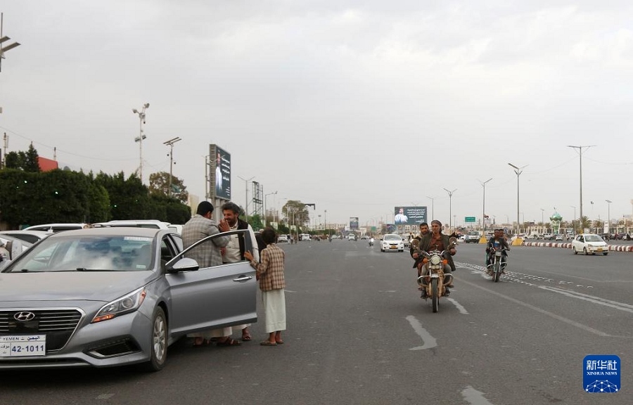 這是3月16日拍攝的也門(mén)薩那街頭景象。