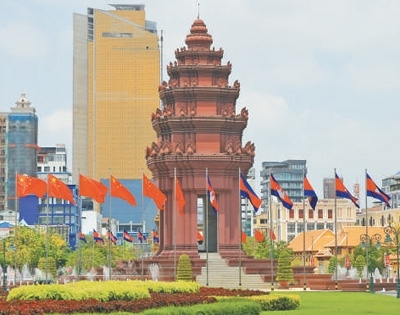4月16日,在柬埔寨首都金邊市中心的獨(dú)立紀(jì)念碑前,中柬兩國(guó)國(guó)旗迎風(fēng)飄揚(yáng)。