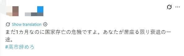 此外,高市在個(gè)人社交媒體上的相關(guān)言論同樣引發(fā)巨大爭議。她近期發(fā)布的帖文在日本網(wǎng)民中激起強(qiáng)烈反響,評(píng)論區(qū)滿是對(duì)其錯(cuò)誤言論的不滿和譴責(zé),不少民眾要求其撤回涉臺(tái)不當(dāng)言論、向中國道歉,并辭去首相職務(wù)。