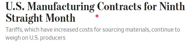 《華爾街日?qǐng)?bào)》1日發(fā)表文章稱,美國供應(yīng)管理協(xié)會(huì)(ISM)當(dāng)天公布的調(diào)查報(bào)告顯示,11月美國制造業(yè)采購經(jīng)理人指數(shù)(PMI)已低于50的榮枯分界線。美國制造業(yè)活動(dòng)連續(xù)第九個(gè)月萎縮,而美國制造商認(rèn)為這主要是因?yàn)槊绹年P(guān)稅政策。