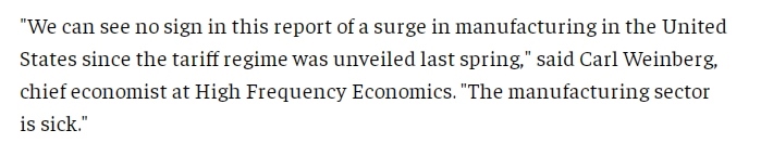 文章指出,美國政府曾辯稱,加征關(guān)稅是保護(hù)美國國內(nèi)制造業(yè)的必要之舉,但經(jīng)濟(jì)學(xué)家則認(rèn)為,由于包括勞動(dòng)力短缺在內(nèi)的結(jié)構(gòu)性問題,美國制造業(yè)已無法恢復(fù)昔日輝煌。文章援引高頻經(jīng)濟(jì)咨詢公司首席經(jīng)濟(jì)學(xué)家卡爾·溫伯格(Carl Weinberg)的話表示,“從(ISM)這份報(bào)告中,我沒有看到自關(guān)稅政策出臺(tái)以來,美國制造業(yè)出現(xiàn)任何增長的跡象,美國制造業(yè)已經(jīng)病了。”
