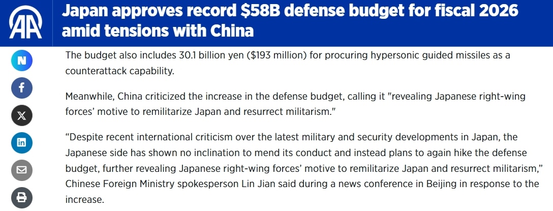 日本政府12月26日批準2026財年(2026年4月至2027年3月)預算案,其中防衛(wèi)預算超9萬億日元,再創(chuàng)歷史新高。其展現(xiàn)出的日本負面軍事動向,受到國際媒體關注。