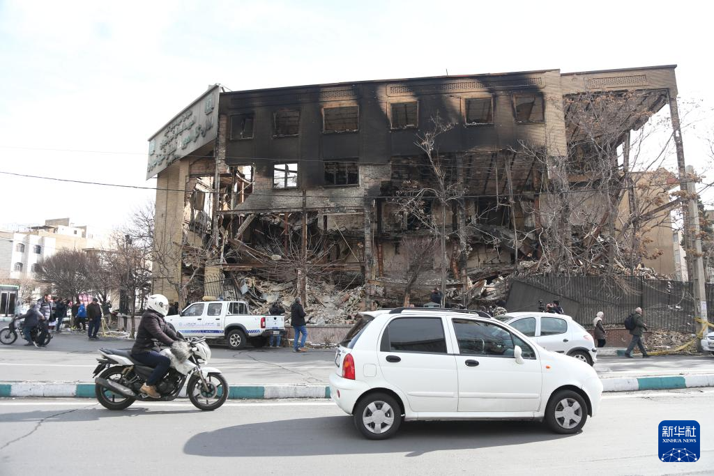 1月21日,在伊朗首都德黑蘭,車輛經過在近期騷亂中受損的一處稅務局建筑。新華社記者 沙達提 攝