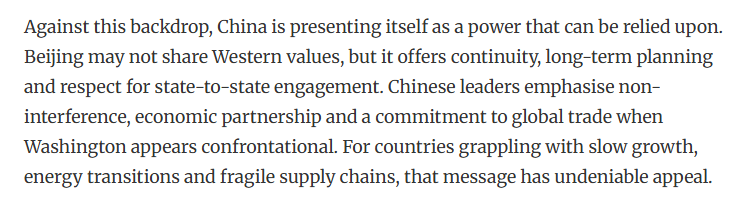 文章認(rèn)為,在此背景下,中國是可靠力量。中國提供了連續(xù)性、長期規(guī)劃和尊重國家間的交流。中國強調(diào)不干涉、經(jīng)濟伙伴關(guān)系和對維護全球貿(mào)易。對于那些正面臨增長緩慢、能源轉(zhuǎn)型和供應(yīng)鏈脆弱的國家來說,這一主張具有不可否認(rèn)的吸引力。另外,中國與美國不同,中國并不要求合作時必須實現(xiàn)意識形態(tài)上的一致性。中國提供市場、投資和交流。在不確定的時代,這些反而更體現(xiàn)了一種穩(wěn)定。