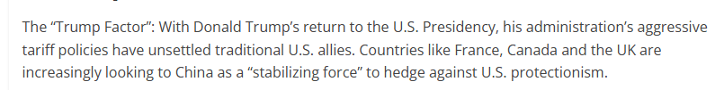 文章說,美國政府的強硬關(guān)稅政策令美國傳統(tǒng)盟友感到不安。法國、加拿大和英國等國家正日益將中國視為“穩(wěn)定力量”,以對沖美國保護主義帶來的風(fēng)險。
