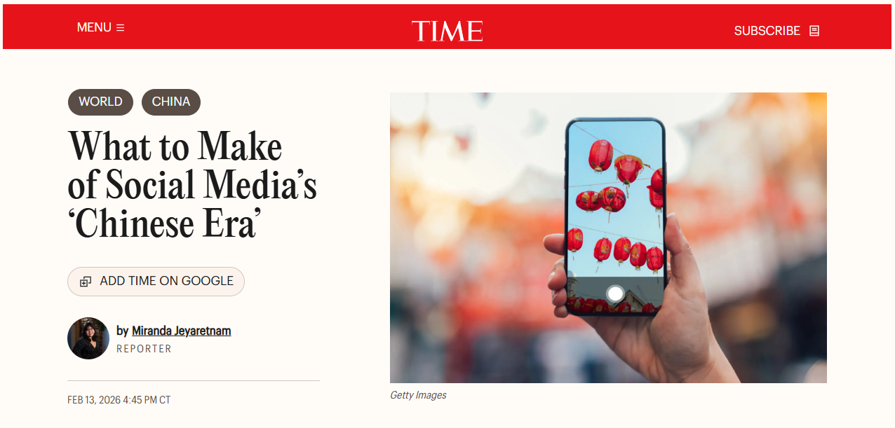 美國《時(shí)代》周刊網(wǎng)站2月13日的一篇文章稱,伴隨著今年的中國新年,社交網(wǎng)絡(luò)上介紹中國文化的內(nèi)容不少。這是一種新的趨勢(shì),美國社交媒體用戶視自己為“中國人”,擁抱“Chinese era”(中國時(shí)代)或者“Chinamaxxing”(極致中國化)。觀察家分析,這一趨勢(shì)反映了隨著中國的開放和軟實(shí)力的提升,人們對(duì)中國越來越著迷。