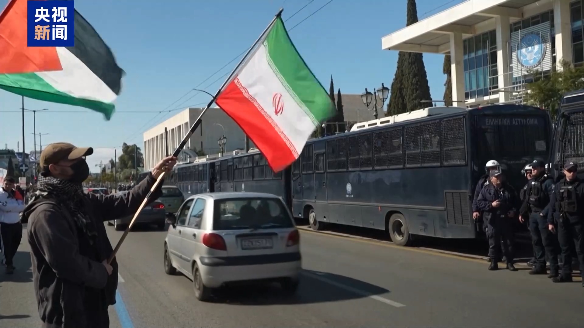 在希臘雅典的美國和以色列大使館前,逾千名示威者手持伊朗國旗或標語牌、高喊口號參與游行示威活動,抗議美以對伊朗發(fā)動襲擊。為維護現(xiàn)場秩序,當?shù)爻鰟哟罅烤Σ⒃诿绹鸵陨写笫桂^前使用一排警用大巴封鎖隔離。