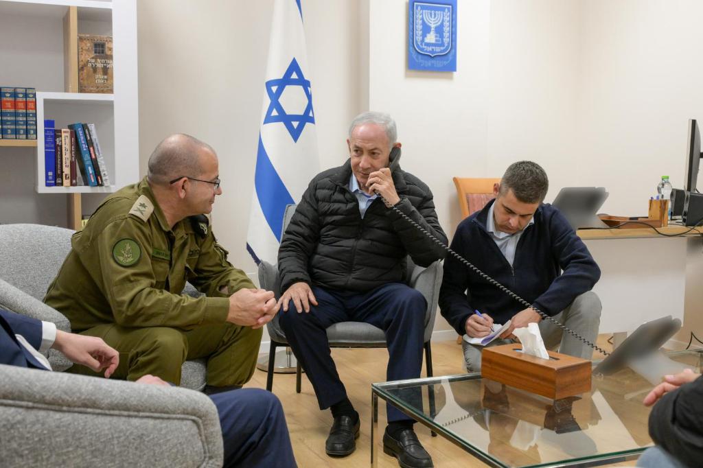 這是以色列總理辦公室3月17日在社交媒體上發(fā)布的以總理內塔尼亞胡(中)與軍方人士一起打電話的圖片。新華社發(fā)