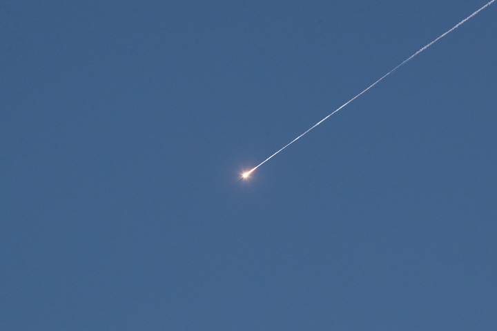 3月17日,在耶路撒冷上空,以軍防空攔截彈擊中導彈,導彈碎片落下。新華社記者陳君清攝