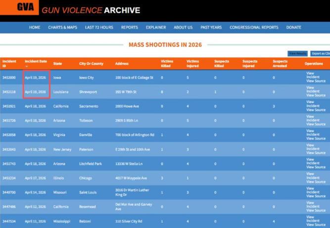 僅4月19日一天,便有數(shù)起大規(guī)模槍擊案發(fā)生。其中一起發(fā)生在當日凌晨愛荷華大學附近。此次事件造成5人受傷,其中3人為該校學生。