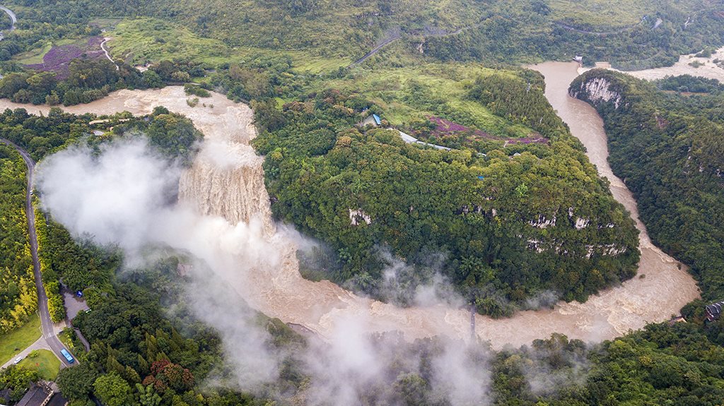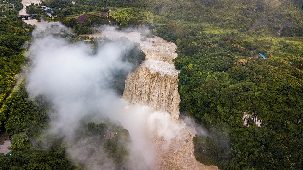 受強(qiáng)降雨影響,貴州黃果樹瀑布迎來2020年入汛以來最大水量,黃果樹瀑布水勢磅礴。陳熙/攝