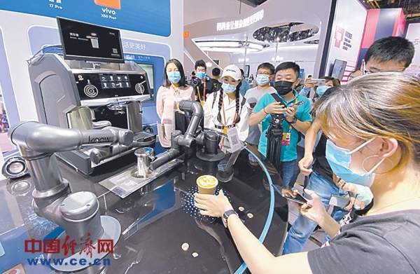 在綜合展區(qū)高通展臺,觀眾們排隊體驗機(jī)器人制作的拉花咖啡。經(jīng)濟(jì)日報-中國經(jīng)濟(jì)網(wǎng)記者袁勇攝