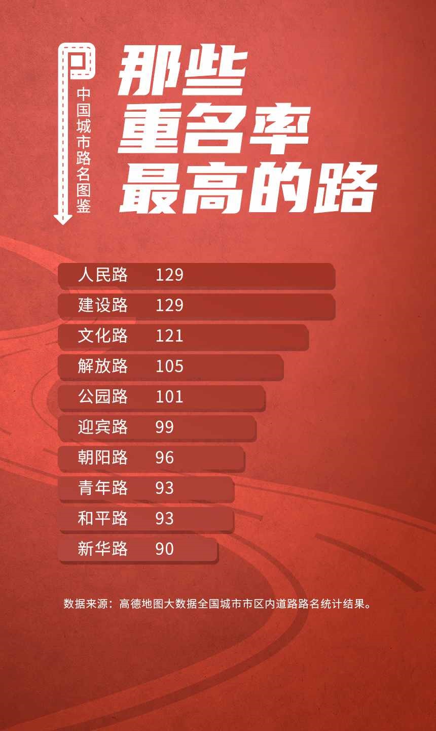 榜單顯示,人民路和建設(shè)路是全國重名率最高的道路,均有129個城市采用。此外,全國胡同最多的城市是北京;弄堂最多的城市是寧波;“小巷”最多的城市都在廣東省,深圳、東莞、中山、佛山和廣州包攬前五;“大道”最多的城市是佛山。
