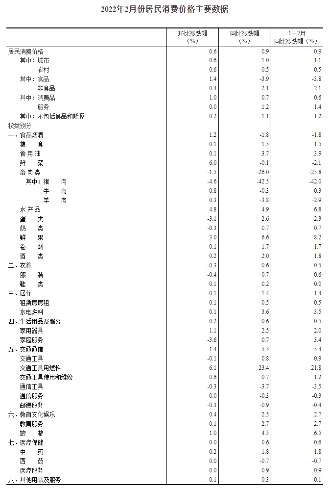 2022年2月份居民消費價格主要數(shù)據(jù)