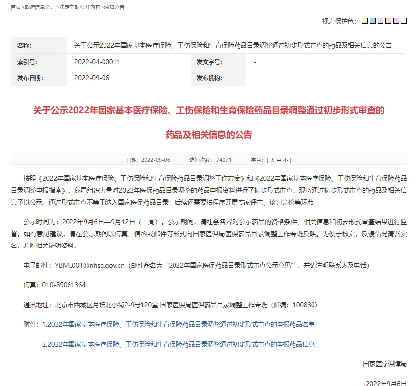 根據(jù)2022年國家基本醫(yī)療保險、工傷保險和生育保險藥品目錄(以下簡稱國家醫(yī)保藥品目錄)調(diào)整工作安排,國家醫(yī)保局近期對申報藥品進行了初步形式審查,并對通過審查的藥品和信息進行了公示。現(xiàn)就有關(guān)工作情況解讀如下。