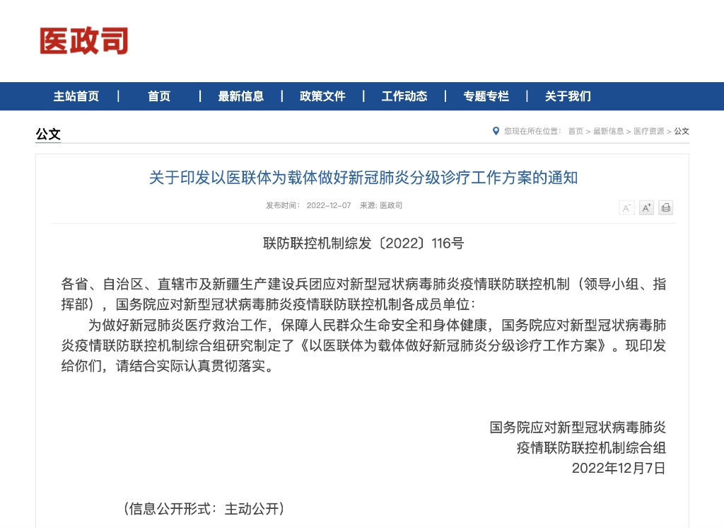 新華社北京12月7日電 為做好新冠肺炎醫(yī)療救治工作,全力保障高齡合并基礎(chǔ)疾病等重癥風(fēng)險(xiǎn)較高的感染者及時(shí)救治,構(gòu)建更加科學(xué)有序的就醫(yī)秩序,國務(wù)院聯(lián)防聯(lián)控機(jī)制綜合組12月7日發(fā)布《以醫(yī)聯(lián)體為載體做好新冠肺炎分級(jí)診療工作方案》。