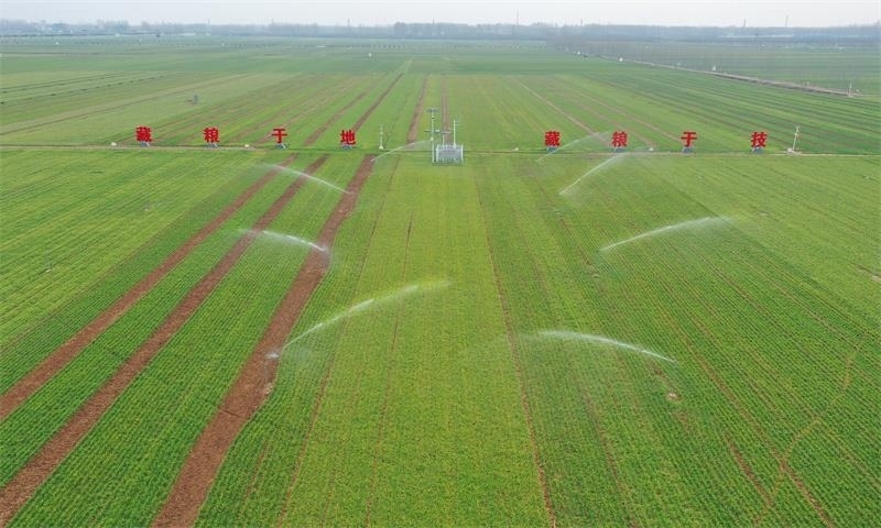 位于河南尉氏縣張市鎮(zhèn)的萬畝高標準農(nóng)田示范區(qū),一排排節(jié)水灌溉噴頭整齊排列、大型自走式噴灌機矗立田間……眼下,這些“高科技”大顯身手,讓麥苗吃上“營養(yǎng)均衡”的早春“第一餐”。