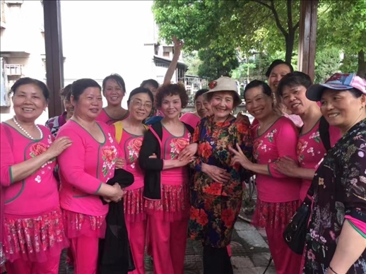 2017年,李淑范(左五)和社區(qū)舞蹈隊(duì)同伴們?cè)谝黄?/p>