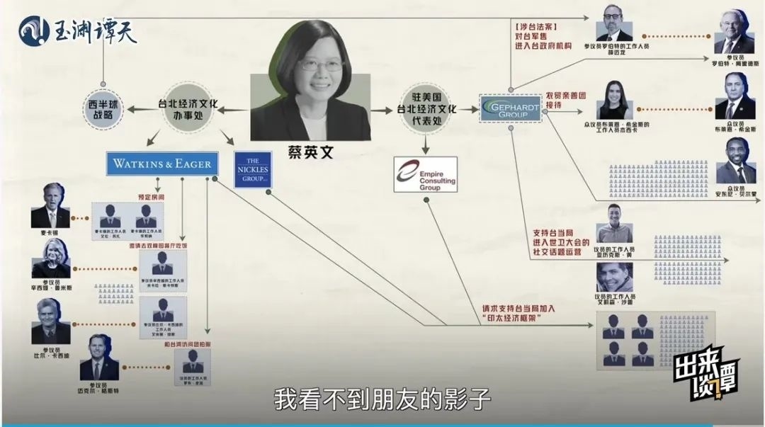 趁熱再打鐵,玉淵譚天繼續(xù)抽絲剝繭,以數(shù)據(jù)視頻《起底!臺(tái)當(dāng)局“朋友圈”大公開(kāi)》深扒臺(tái)當(dāng)局近兩年在美國(guó)登記在冊(cè)的游說(shuō)方式與對(duì)象,用翔實(shí)的數(shù)據(jù),揭秘了臺(tái)當(dāng)局能接觸到的美國(guó)會(huì)人員多為邊緣人的真相,結(jié)合送“保護(hù)費(fèi)”、送“官職”等賣臺(tái)行為實(shí)錘,讓臺(tái)當(dāng)局在所謂“美臺(tái)關(guān)系”中的卑微姿態(tài)展露無(wú)遺。