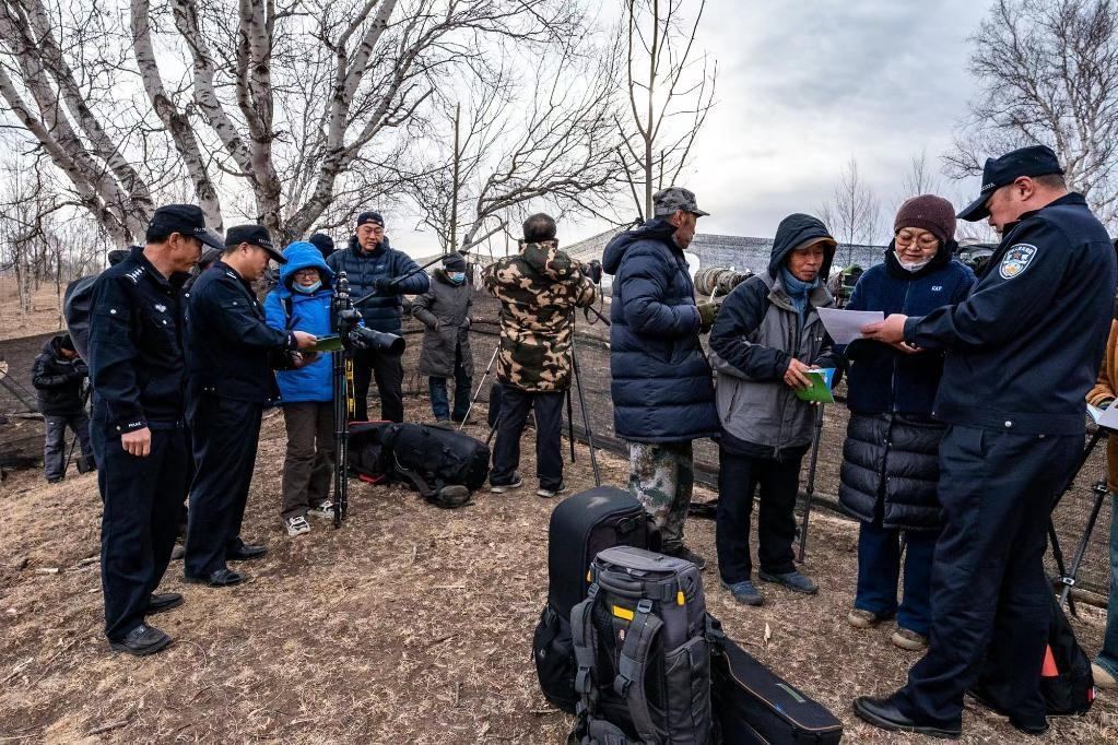 4月17日,民警在向攝影愛好者宣傳鳥類保護(hù)知識(shí)。(宿海東 攝)