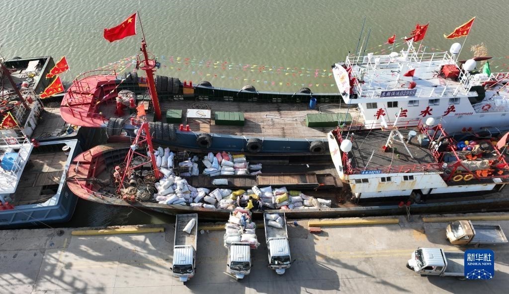 4月30日,在江蘇省連云港市贛榆區(qū)青口漁港碼頭,漁民在卸載漁具,為即將到來的伏季休漁做準備(無人機照片)。