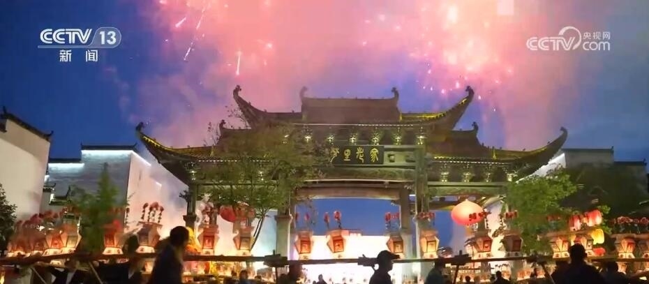 隨著夜色降臨,在江西婺源縣演藝廣場上,百米長龍演藝隊伍開始游行,浩浩蕩蕩熱舞而行,龍尾鼓壓陣,龍珠引路。伴隨著漫天煙火,板凳龍舞出綽約風姿,場面氣勢恢宏,蔚為壯觀。