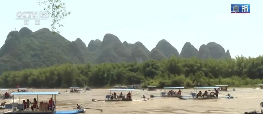 桂林山水甲天下,漓江沿線正是桂林山水最典型的代表?,F(xiàn)在已經(jīng)是廣西的汛期,降雨開始增多。大家通過畫面可以看到,漓江的水不像前幾天那樣清澈,這是因?yàn)榍疤?,桂林剛剛?jīng)過一場強(qiáng)降雨,上游來水增加。在漓江之上,無論陰晴雨霧,都是不同的風(fēng)景。像今天這樣的晴天麗日,在漓江上穿行就像在欣賞一幅青綠山水;而在陰雨天,又像是穿行在傳統(tǒng)的水墨畫之中。根據(jù)桂林海事部門預(yù)測,“五一”假期,桂林水上發(fā)送旅客量超過30萬人次,這幾天旅游公司的船票基本上都是提前售完的狀態(tài)。
