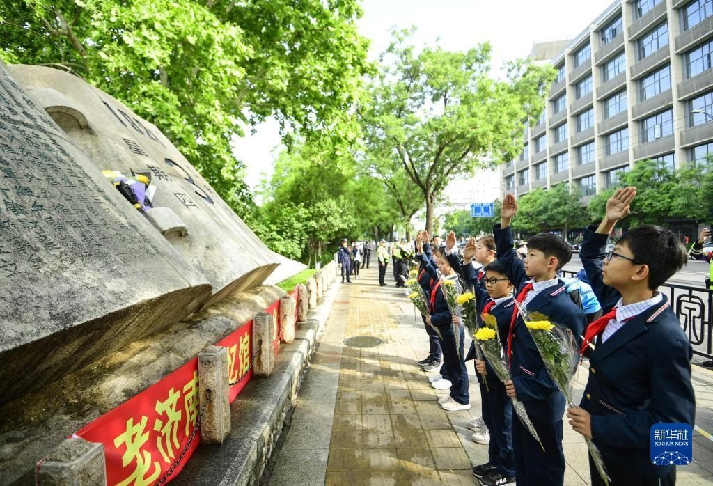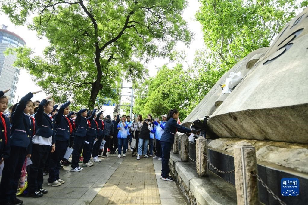 5月3日,小學(xué)生在“五三慘案”紀(jì)念碑前悼念。   新華社記者 朱崢 攝