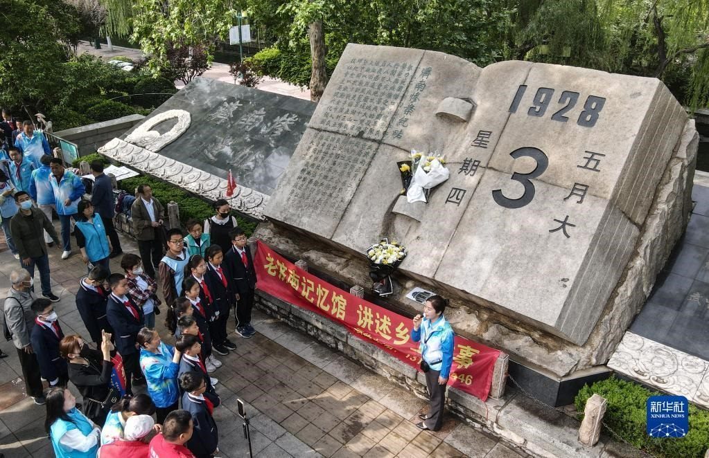 5月3日,小學(xué)生在“五三慘案”紀(jì)念碑前聽(tīng)志愿者講述歷史。
