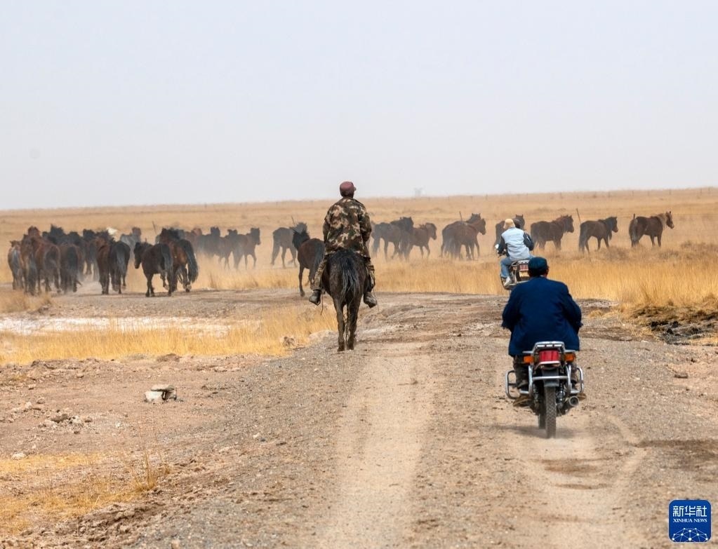 5月3日,在阿克塞縣阿伊納鄉(xiāng)海子草原,馬群轉場去往夏季牧場。