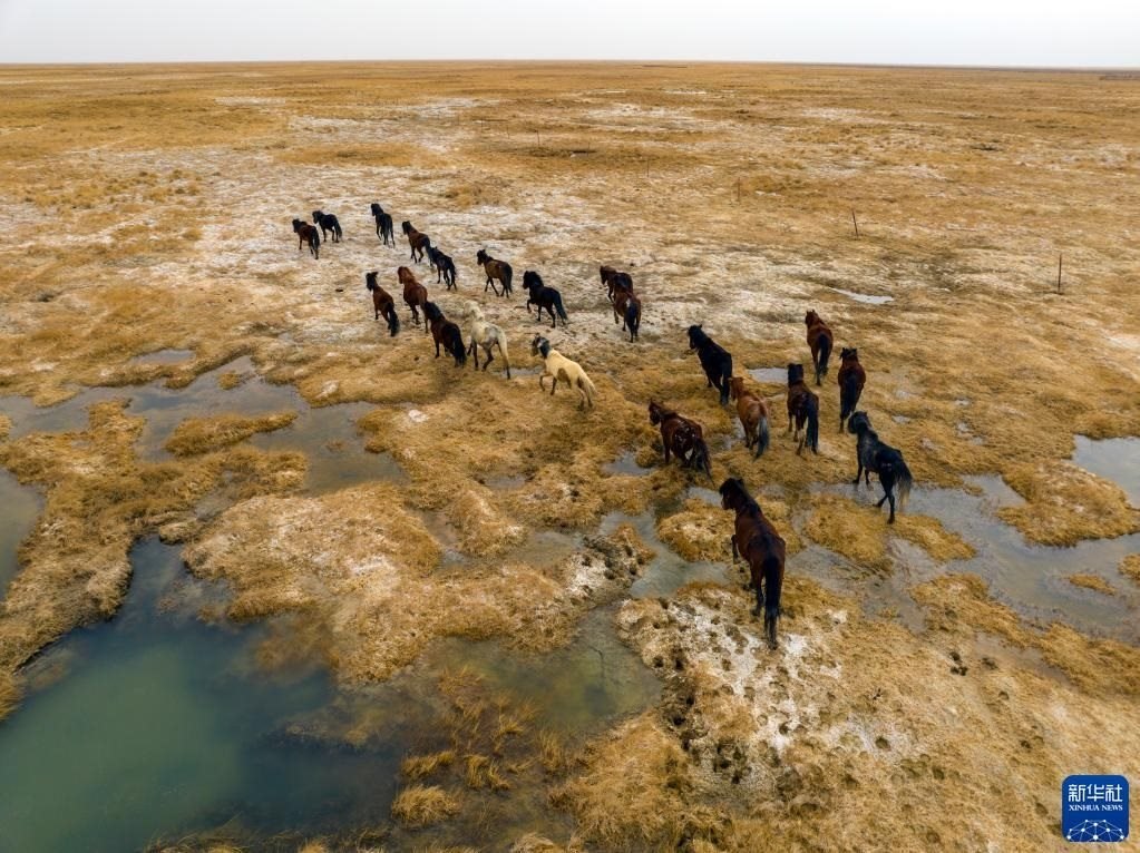 5月3日,在阿克塞縣阿伊納鄉(xiāng)海子草原,馬群轉場去往夏季牧場(無人機照片)。