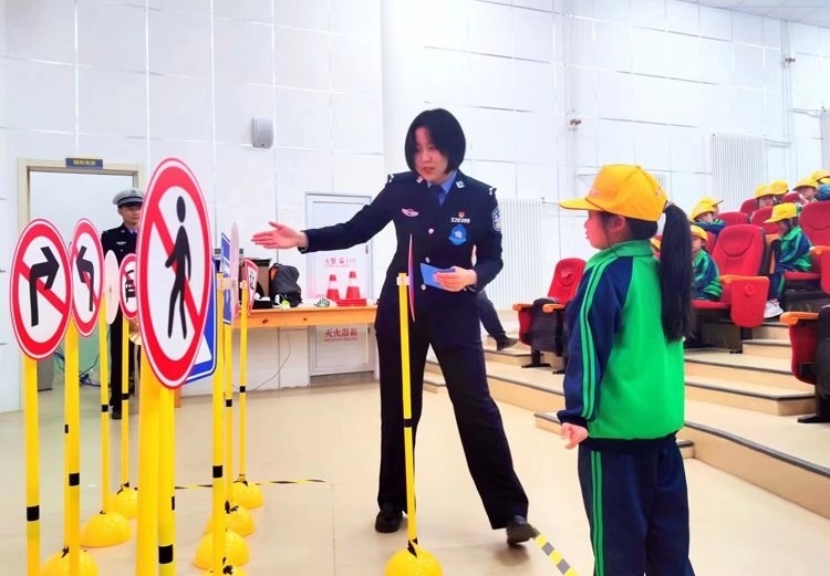 學(xué)警教同學(xué)識(shí)別交通道路標(biāo)志牌。
