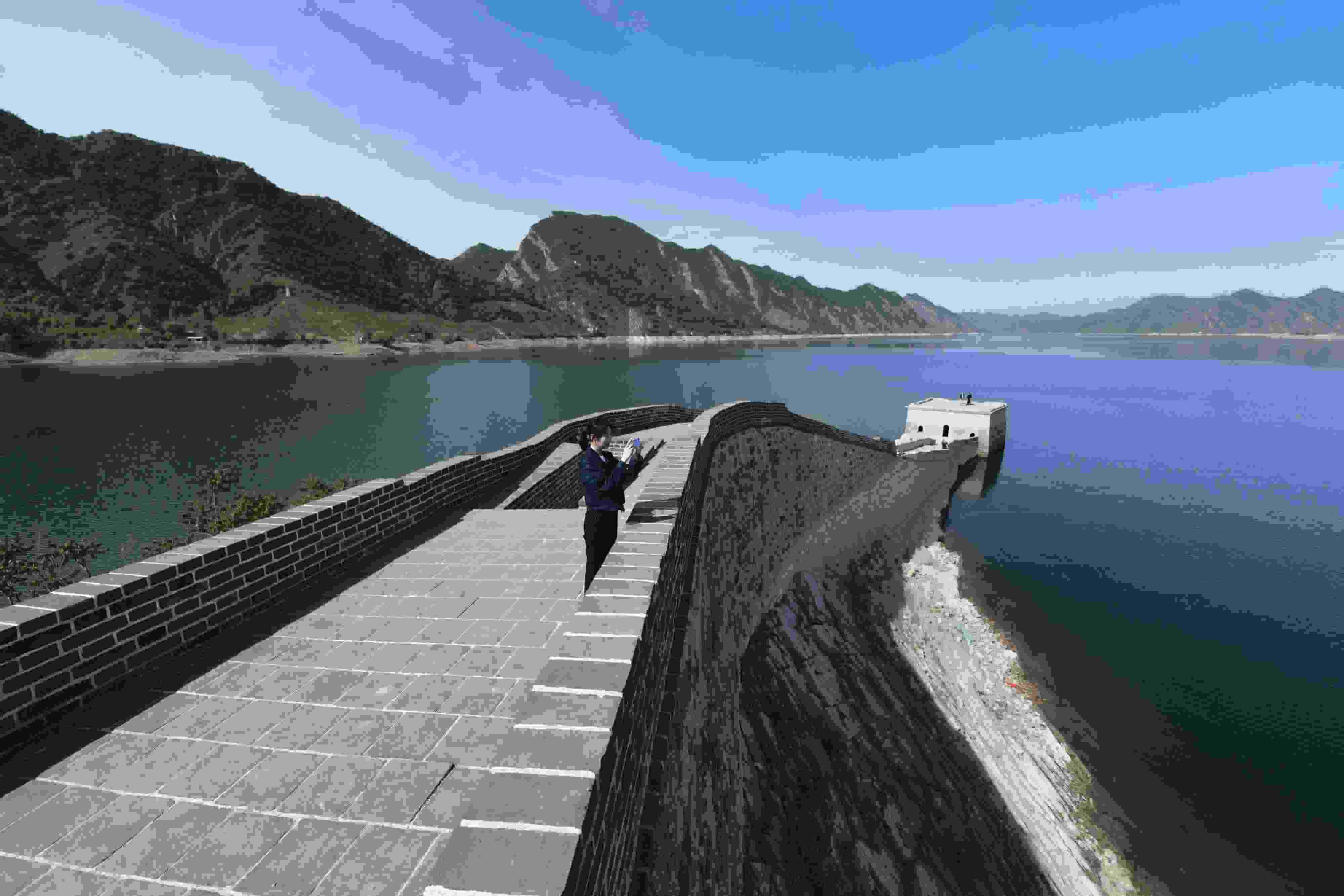 2023年5月8日,河北承德,寬城滿族自治縣境內(nèi)潘家口水庫(kù)的“水下長(zhǎng)城”。這段“水下長(zhǎng)城”是明長(zhǎng)城的遺址,20世紀(jì)70年代因建設(shè)水利樞紐工程,部分長(zhǎng)城隱沒水下,從而形成“水下長(zhǎng)城”景觀。 視覺中國(guó)