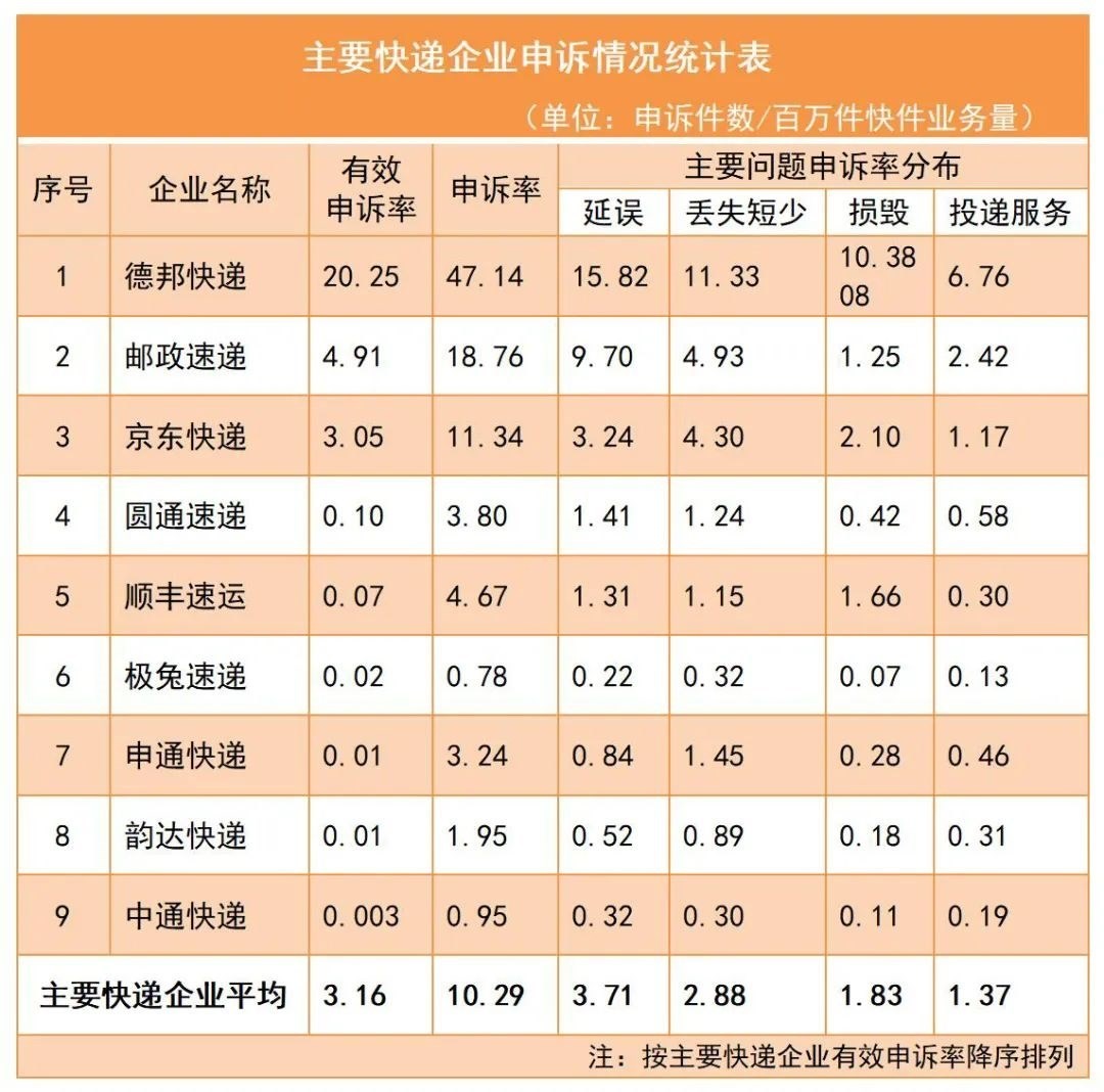 3.主要快遞企業(yè)申訴率情況。主要快遞企業(yè)申訴率(百萬件快件業(yè)務量)平均為10.29,有效申訴率平均為3.16。用戶對快遞服務申訴主要問題中,快件延誤申訴率平均為3.71,快件丟失短少申訴率平均為2.88,快件損毀申訴率平均為1.83,投遞服務申訴率平均為1.37。
