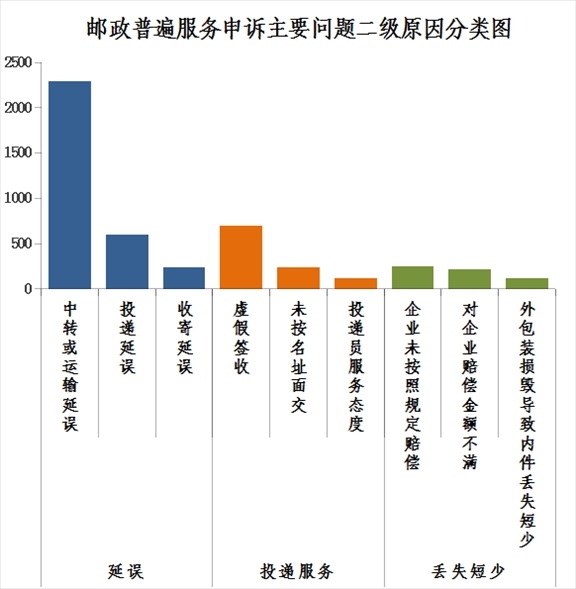2.郵政普遍服務申訴主要問題二級原因情況。郵件延誤申訴中主要占比較多的是中轉或運輸延誤,投遞服務申訴中主要占比較多的是虛假簽收,郵件丟失短少申訴中主要占比較多的是企業(yè)未按照規(guī)定賠償。