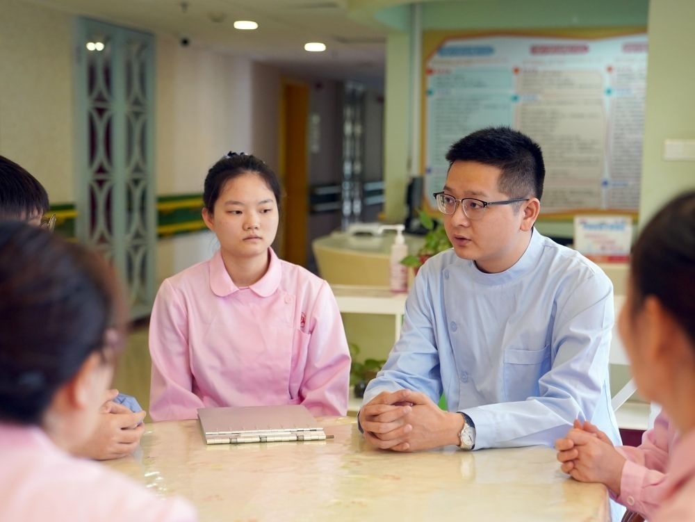 在上海市楊浦區(qū)社會(huì)福利院,護(hù)理主管王程(右)在護(hù)理員例會(huì)上點(diǎn)評(píng)發(fā)言(4月28日攝)。新華社記者 劉穎 攝