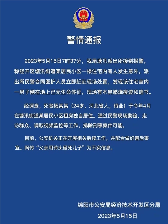 ·網(wǎng)傳“父親用磚頭砸死兒子”?綿陽(yáng)警方通報(bào):排除刑案可能,現(xiàn)場(chǎng)發(fā)現(xiàn)木炭燃燒痕跡和遺書(shū)。