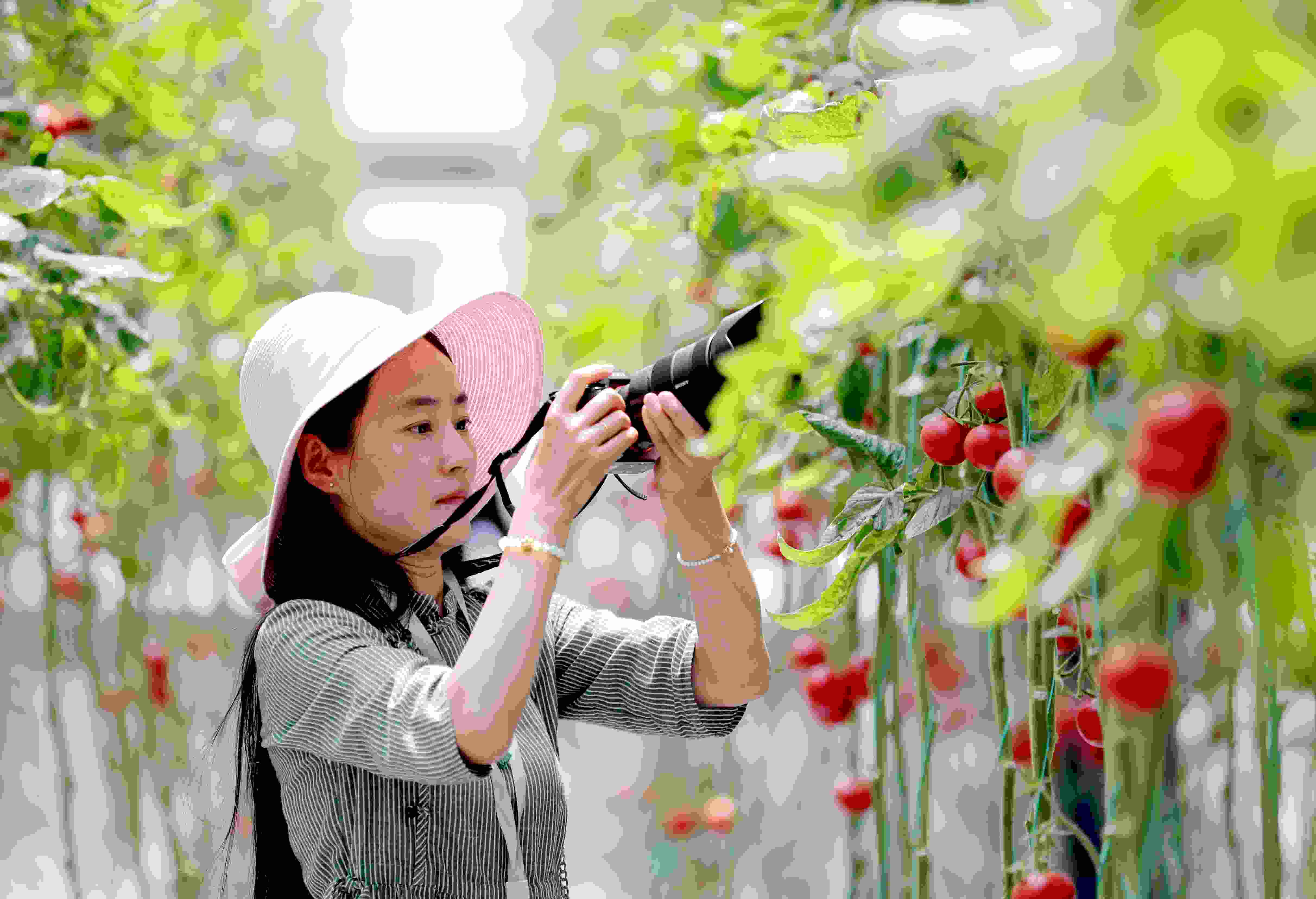 5月15日,游客在青島市即墨區(qū)北安街道一家智慧農(nóng)場體驗采摘樂趣。