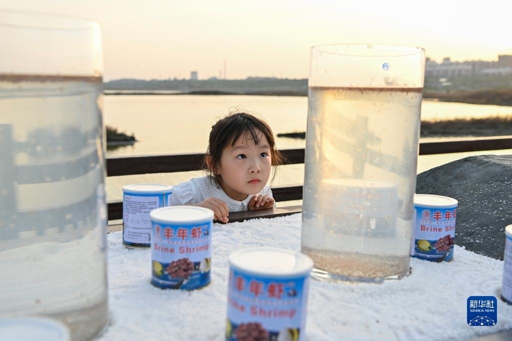 5月16日,小朋友在運城鹽湖觀察展出的鹵蟲。   新華社記者 楊晨光 攝