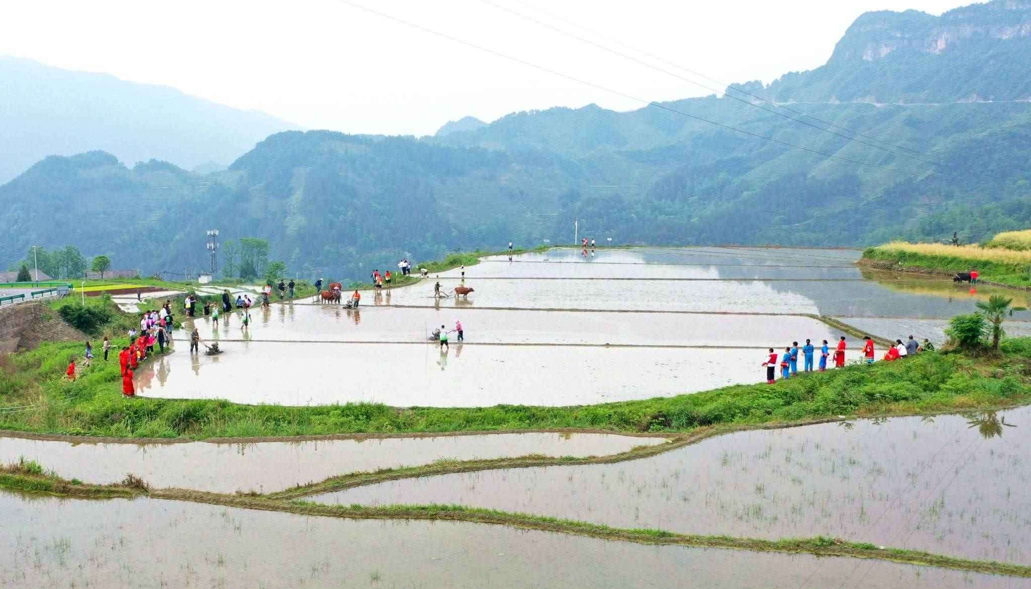 2023年5月19日,重慶,酉陽縣花田鄉(xiāng)何家?guī)r村的梯田里,村民們正在進(jìn)行犁田插秧比賽,向游客展示農(nóng)耕文化魅力。視覺中國