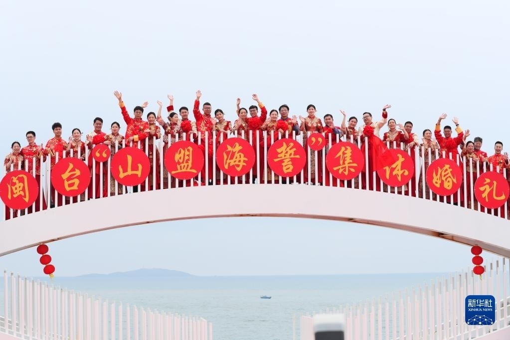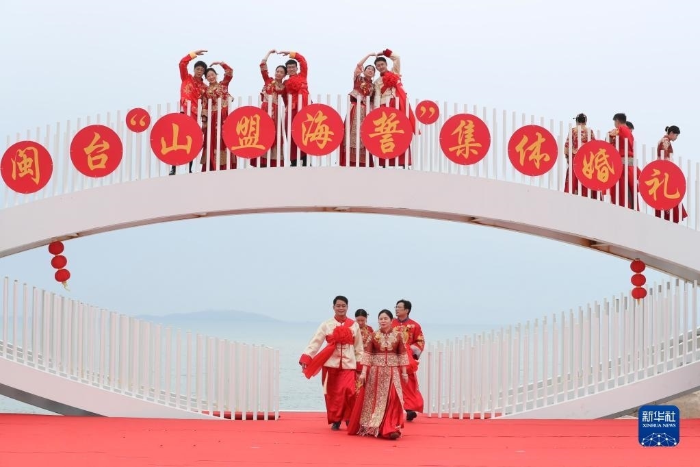 當(dāng)日,一場(chǎng)以“愛情恒久遠(yuǎn)、幸福長相伴”為主題的閩臺(tái)“山盟海誓”集體婚禮暨2023年閩臺(tái)婚姻家庭交流活動(dòng)在福建省福州市平潭縣舉辦。21對(duì)閩臺(tái)新人身穿紅色中式婚服,手牽紅繡球,行跨火盆、踩瓦片、扎繡球和“合茶”、“合巹”、“海誓”等閩臺(tái)傳統(tǒng)結(jié)婚禮儀,結(jié)下跨越海峽的姻緣。