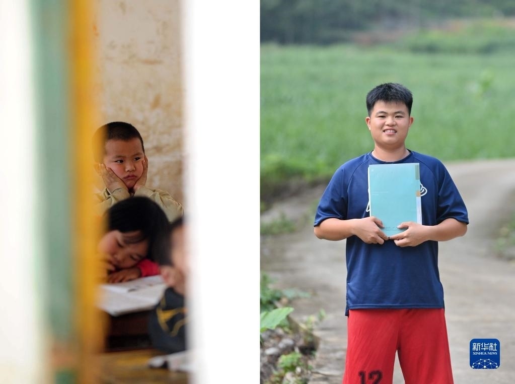 拼版照片:左圖為2012年3月27日,在大化瑤族自治縣大化鎮(zhèn)仁良小學(xué),6歲的韋康濤在教室里上課(新華社記者黃孝邦攝);右圖為在大化瑤族自治縣高級中學(xué)讀高二的韋康濤(新華社記者胡星宇 2023年5月21日攝)。韋康濤的夢想是考上理想的大學(xué)。   新華社發(fā)